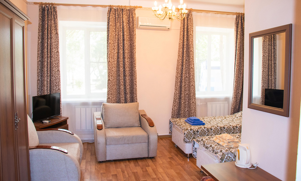 Ежедневная уборка номера. В РЦ «Алые Паруса» подготовлено 5 номеров следующих категорий: однокомнатный одноместный «Стандарт», двухкомнатный двухместный «Стандарт», трехкомнатный четырехместный «Люкс», трехкомнатный двухместный «Люкс», апартаменты-шале двухместные.