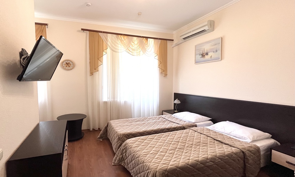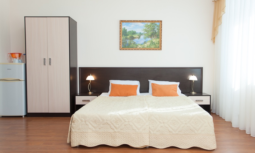 В числе удобств номеров пансионата «Гренада» телевизор с плоским экраном, кондиционер, холодильник, чайник, фен и шкаф для одежды.