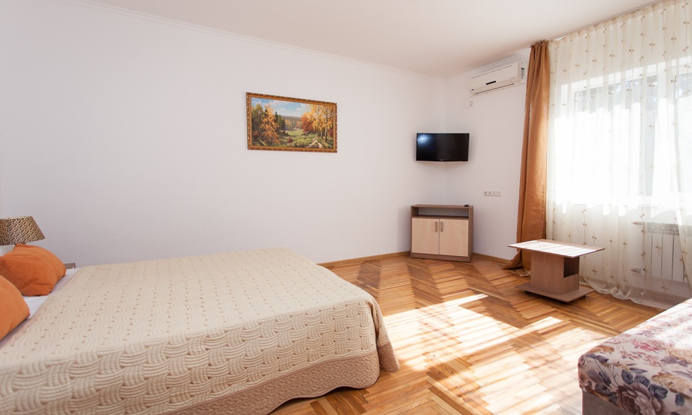 В числе удобств номеров пансионата «Гренада» телевизор с плоским экраном, кондиционер, холодильник, чайник, фен и шкаф для одежды.